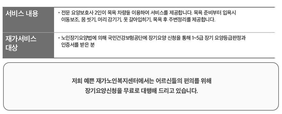 방문목욕이란, 방문목욕서비스는 요양보호사 2명이 이동식욕조 등 장비를 가지고 대상자의 가정을 방문하여 목욕서비스를 제공하는 것입니다. 방문목욕 대상자 노인장기요양보험법에 따라 장기요양인정 신청을 하여 국민건강보험공단으로부터 '장기요양인정서'를 받은 분 (즉, 요양등급을 받은 분) 방문목욕 서비스 내용 방문목욕은 노령 또는 중증 장애로 거동이 불편하여 스스로 목욕을 하지 못하는 대상자에게 목욕서비스를 제공으로 신체적 청결과 근육경축 예방 및 심신의 기능을 향상시키고 안정된 생활을 유지시켜 줍니다. 1)목욕 전 신체 상태를 확인합니다.(기저귀 착용하는 대상자의 경우 욕조에 들어가기 전에 배변상태를 확인 후 입욕) 2)목욕물 온도는 개인차가 있으므로 대상자의 표정과 움직임을 관찰하고, 욕창 등 상처가 있는 경우 환부를 보호하면서 서비스를 제공합니다. 3)목욕 후 환부를 깨끗히 건조 후 필요한 소독이나 처치 후에 옷을 입힙니다.